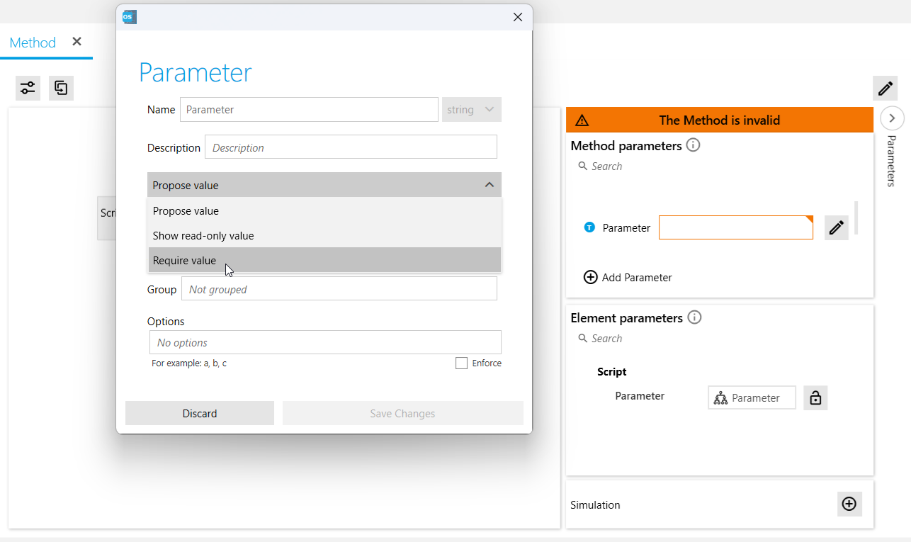We closed this loophole and now enforce a consistent configuration for every parameter. If you want to not propose a default value and always require the user of your method to set the value, you can configure the parameter as Require value.