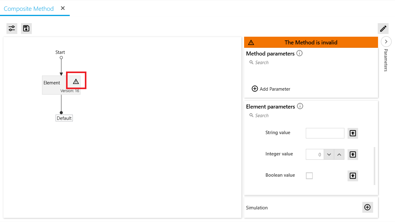 If an element within a Composite Method is invalid, the Composite Method itself will be invalid. The problematic element can be identified by the warning icon (see screenshot).