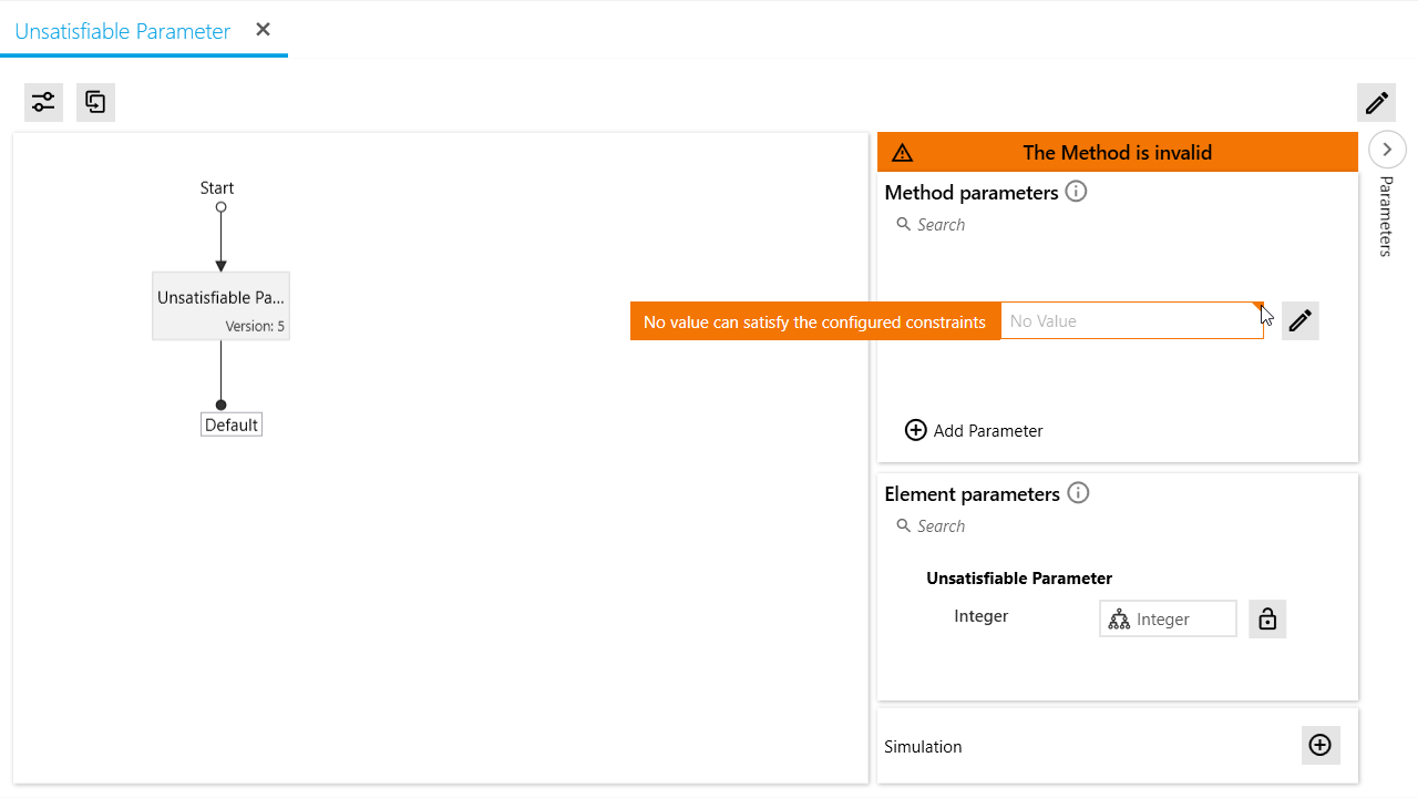 The example shown above illustrates an unsatisfiable parameter scenario: the method parameter is set to only accept values between 1 and 5. It overrides the “Integer” parameter which only accepts values between 6 and 10. The 1-5 and 6-10 limitations do not overlap, therefore, no value can satisfy the method parameter.