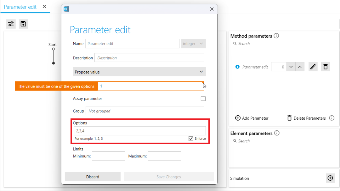 In previous versions, the software automatically estimated the nearest compliant value when a parameter argument or default fell outside its defined constraints. Because this value was not explicitly chosen by the Method editor, its subsequent use in an Assay could lead to unexpected or inconsistent results.