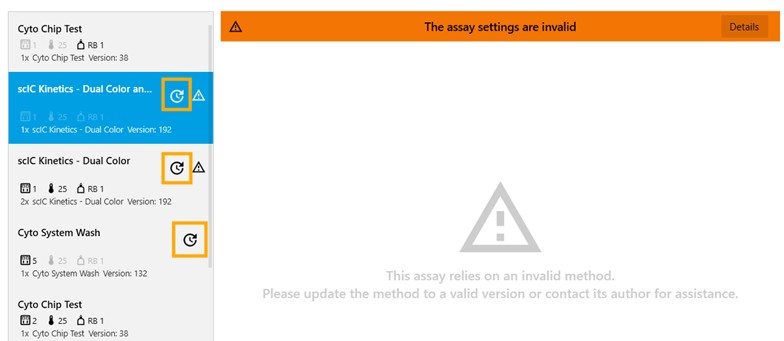 IMPORTANT : If custom methods or assays are used, please ensure that the individual building blocks are up-to-date as well by clicking on the clock icon, which will automatically appear when opening them in the Method tab.